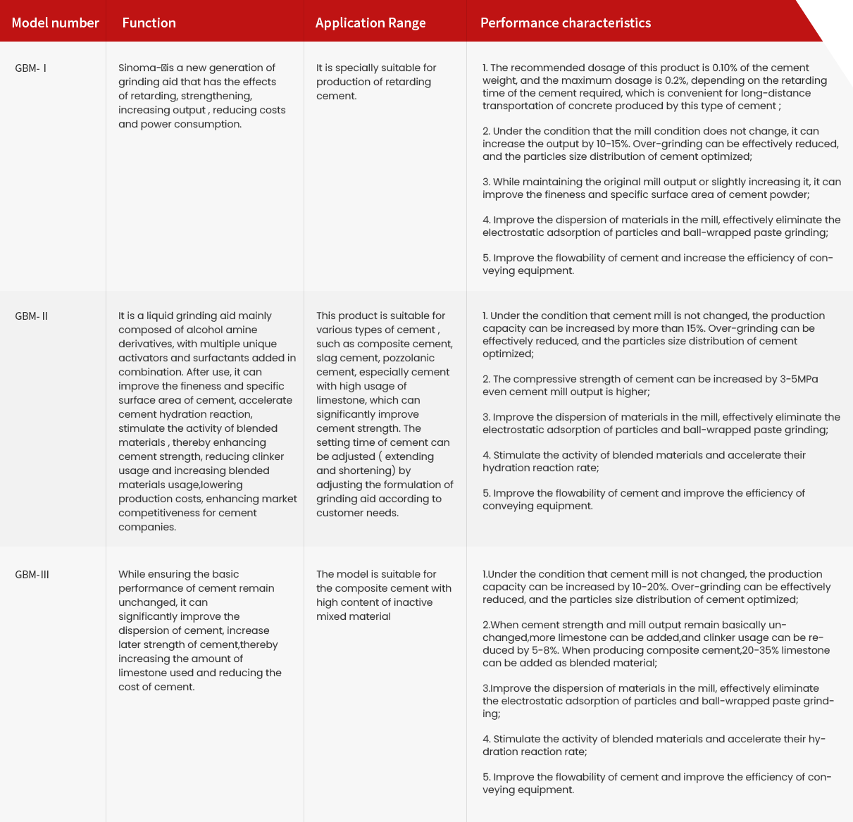 Cement grinding aids are chemical additives that improve cement grinding effectiency and performance, significantly increasing the hourly output of cement mills, enhancing cement strength at all ages, and improve cement fluidity.